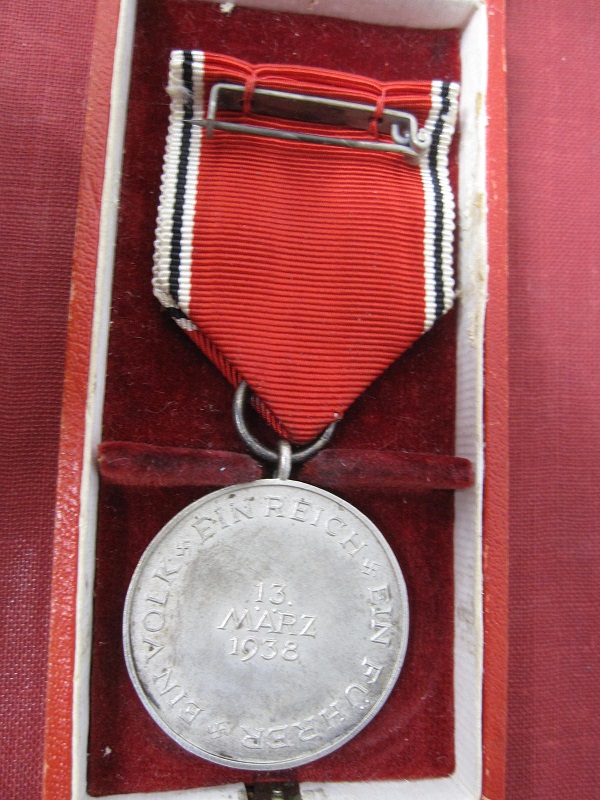 The Union of Austria with Germany dated 1938 is with its original box and also comes with is ribbon and hanging back pin.