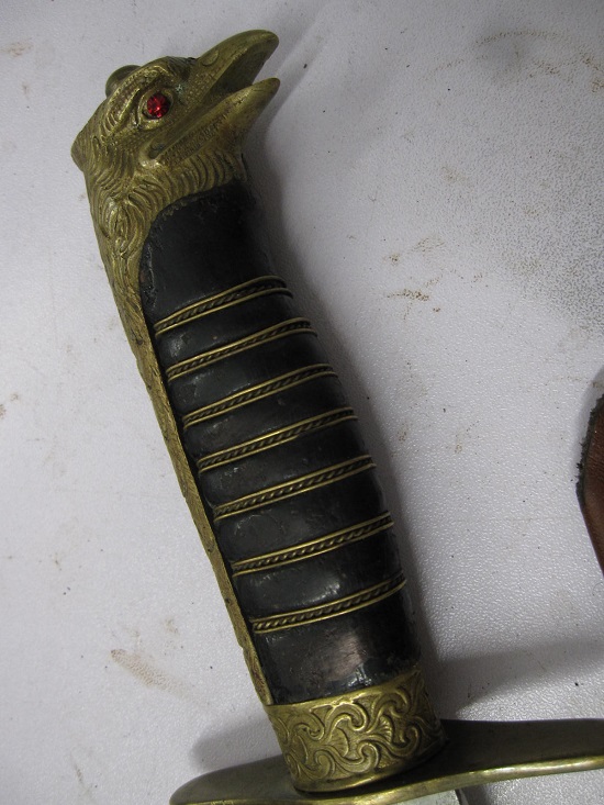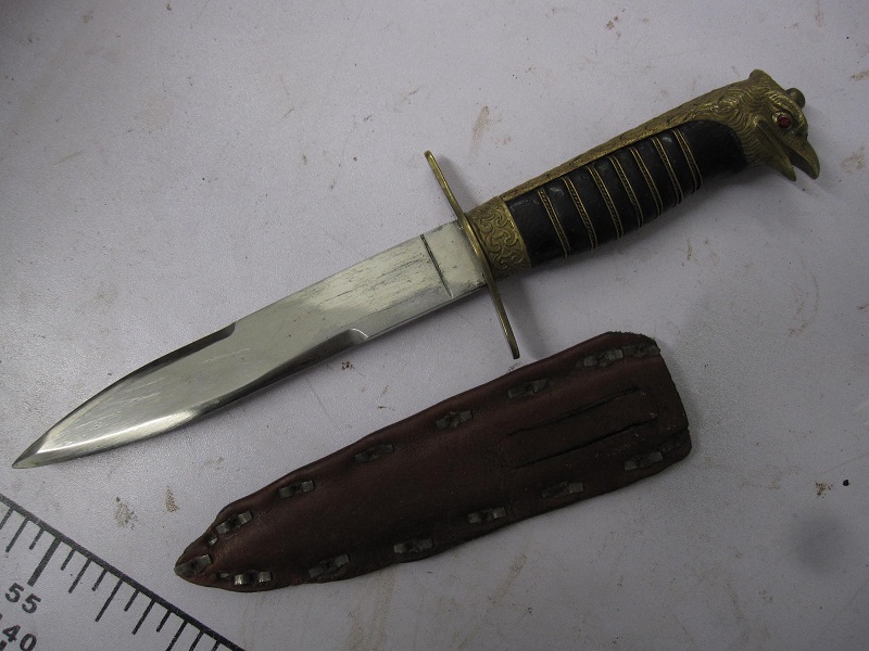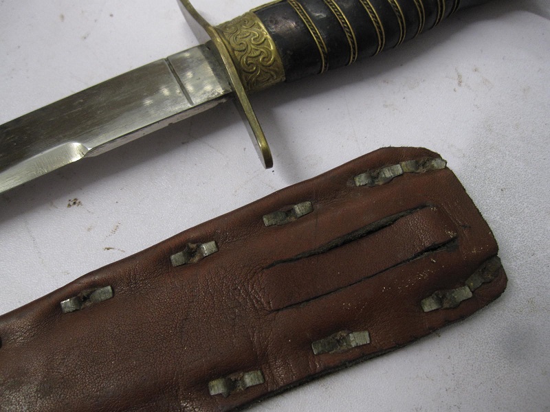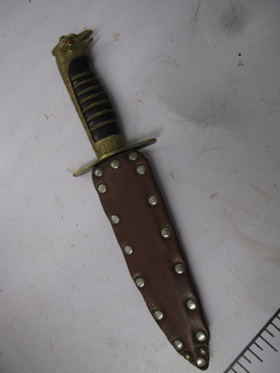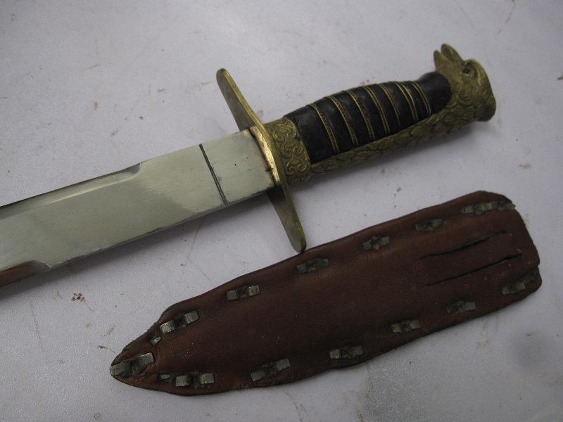 This is a very nice and original organization GIL ,, Gioventu Italiana del Littorio Fascist Youth Dagger with the original home made leather studded scabbard . has the back loops for the belt. the eagles head grip and also a very good and beautiful clear blade . now as usual this dagger has no makers markings.