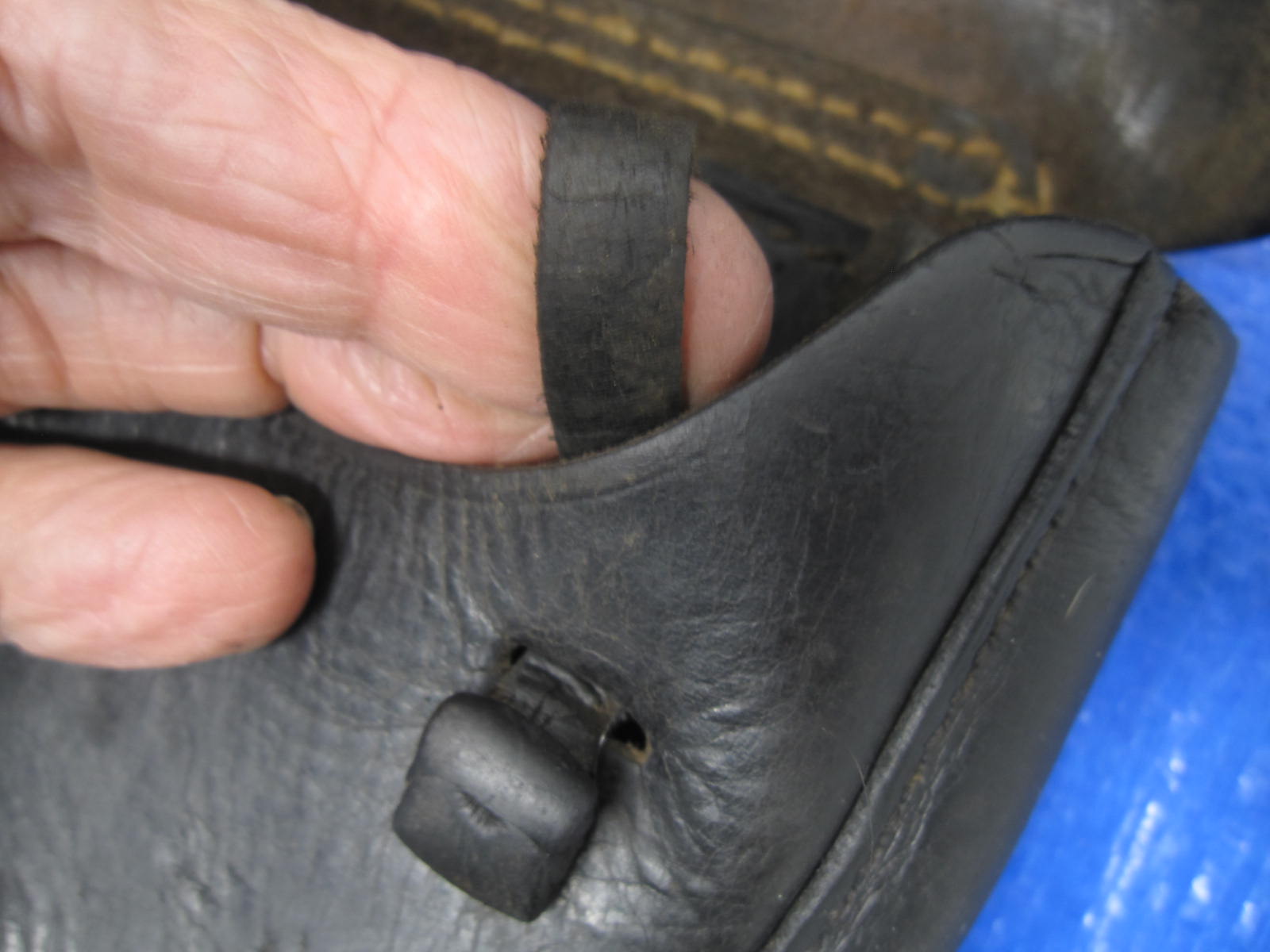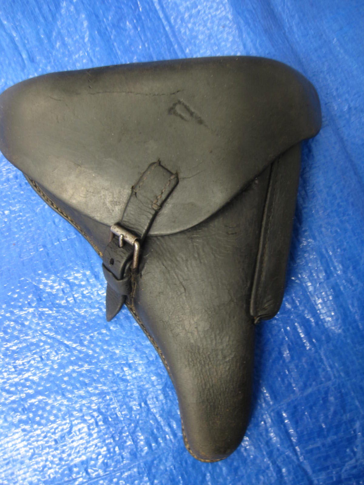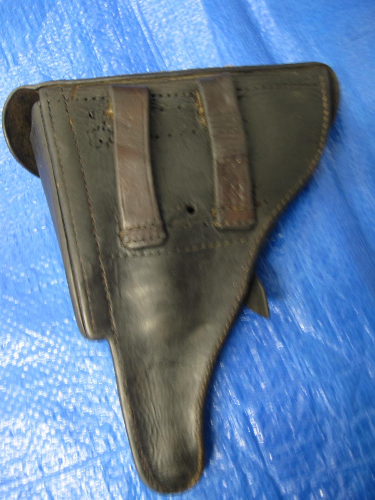 A wartime been there Luger Holster that has one loop period repair that also takes the P38 . has the top shell finishing and is waffen ampt swastika stamp on the back. the black leather is in good shape .