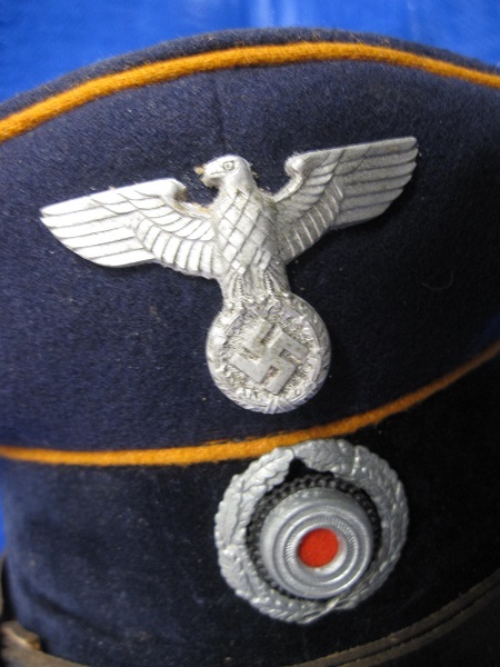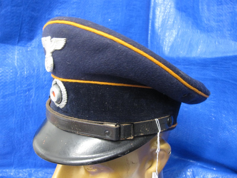 Again this cap has come from a Deceased collection and is in top condition. the cap is very rare and is wartime with the city’s name stamped on the inner sweat band. Lublin in Poland ,,The General Government .the over all original condition is very good. this cap also has the Prussian blue crown with its yellow piping. comes with the makers name inside and a small metal button on the inner band which may mean the original owners name initials .