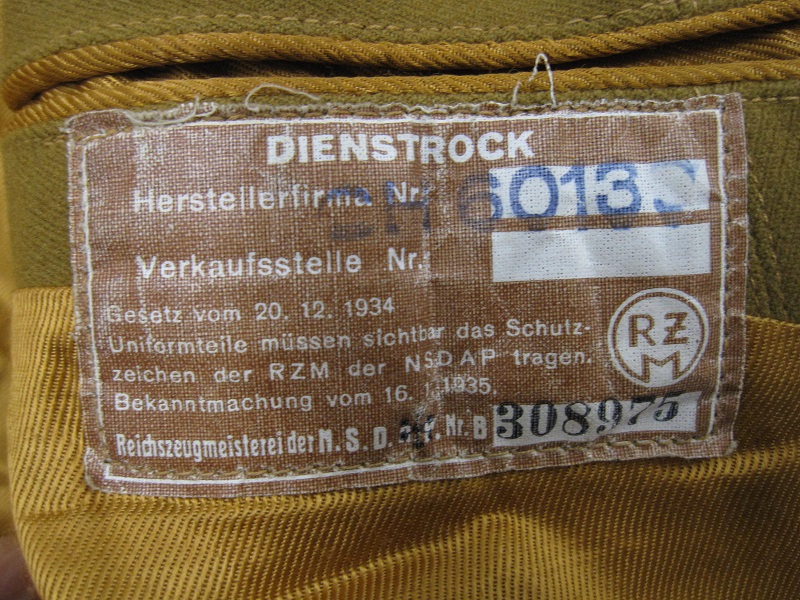 A very good conditioned Political NSDAP Party Tunic that has no moth damage and also has the early large size RZM Label inside of both the trousers and the jacket. this tunic has the gold silk inner liner plus all matching buttons .the tunic is a big size and comes with the trousers . I have updated the uniform with the original Ort level collar patches that would have been their to complete the jacket. the belt is not included in the price which can be offered if wanted at a negotiated price.